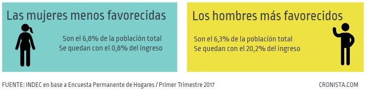 * La población más desfavorecida en la Argentina son mujeres -representan un 6,3% del población total-, y se queda con un 0,8% de los ingresos totales, mientras que la población más favorecida está integrada solamente por hombres -son un 6,7% de la población total- y se quedan con el 20,2%.