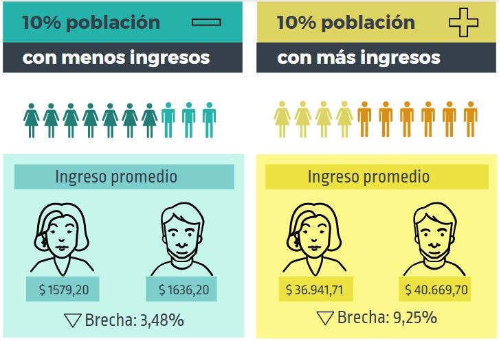 * Incluso adentro del decil con menos ingresos, las diferencias de ingresos entre varones y mujeres se mantiene: ellas ganan en promedio $1575,20 mensuales, mientras que ellos generan $1636,20 mensuales en promedio (un 3,87% más).