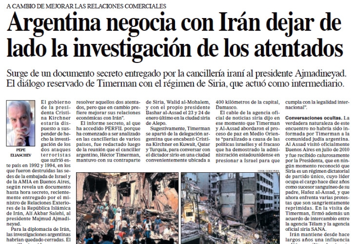 El fallecido periodista reveló el sábado 26 de marzo de 2011 en Diario Perfil el acuerdo secreto entre el Gobierno argentino e Irán por la investigación sobre la AMIA. Se llamó "Argentina negocia con Irán dejar de lado la investigación de los atentados".