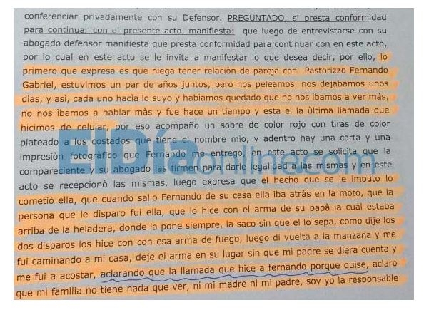 A las 22:42 de ese mismo día, ya en la audiencia de imputación en su contra, la sospechosa negó el vínculo pero reconocía haber baleado al joven. Algunos tramos de ese aspecto del relato son escalofriantes.