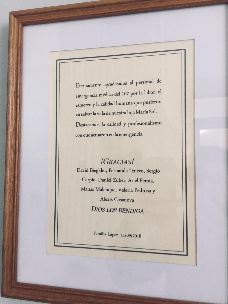 La paciente estuvo en el shockroom por unas horas y tras estar estable fue derivada al Sanatorio San Jerónimo donde permaneció internada por unos días. A manera de agradecimiento sus padres decidieron colocar dos placas en el Hospital Cullen en reconocimiento al excelente trabajo realizado que le devolvió la vida a su hija. De esta manera colocaron dos placas: una agradeciendo al 107 y otra agradeciendo al personal de shockroom que permitieron que María Sol tenga una nueva oportunidad de vida.
