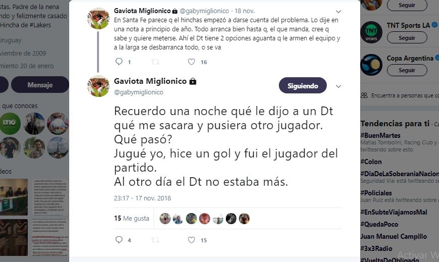 Luego de la derrota de Colón ante Unión de Sunchales, donde Javier Correa y Matías Fritzler apuntaron algunas culpas hacia la dirigencia de Colón, “Gaviota” salió al cruce del presidente José Vignatti y sin nombrarlo contó: “En Santa Fe parece q el hinchas empezó a darse cuenta del problema. Lo dije en una nota a principio de año. Todo arranca bien hasta q, el que manda, cree q sabe y quiere meterse. Ahí el Dt tiene 2 opciones aguanta q le armen el equipo y a la larga se desbarranca todo, o se va”.
