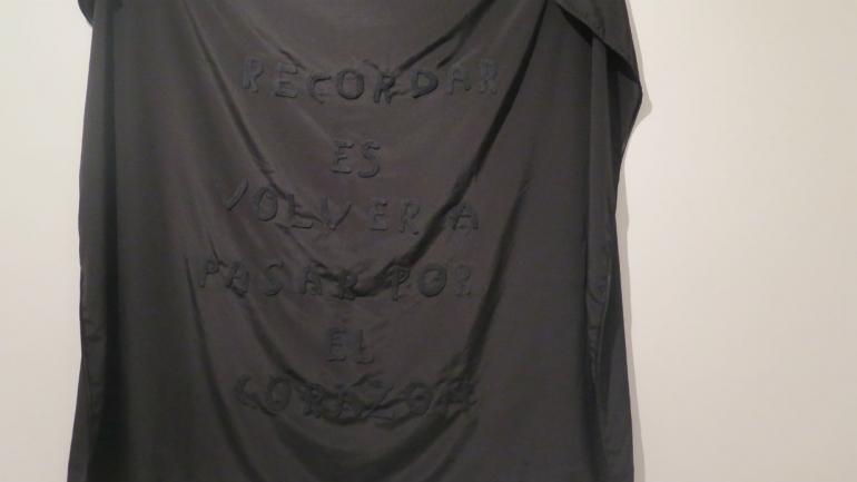 "La obra está conformada por dos piezas textiles monocromas que proponen al espectador un acercamiento físico necesario para poder leer el texto escrito en ellas, un lienzo blanco con letras de crochet blancas y un lienzo negro con letras de chochet negras que testimonian dos posibilidades ante el recuerdo", explicó la artista sobre su puesta.