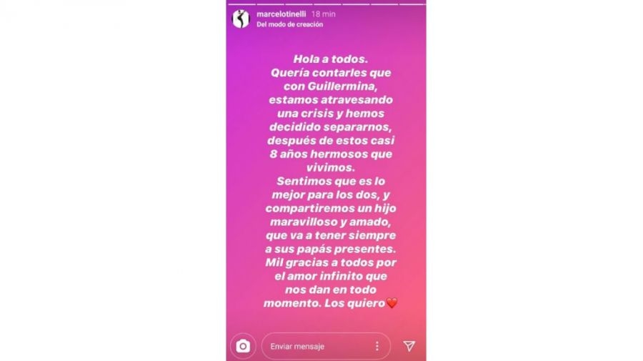 "Sentimos que es lo mejos para los dos y compartimos un hijo maravilloso y amado que va a tener siempre a sus papás presentes. Mil gracias a todos por el amor infinito que nos dan en todo momentos. Los quiero", finalizó en su comunicado Marcelo, quien todavía sigue a su actual ex en las redes.
