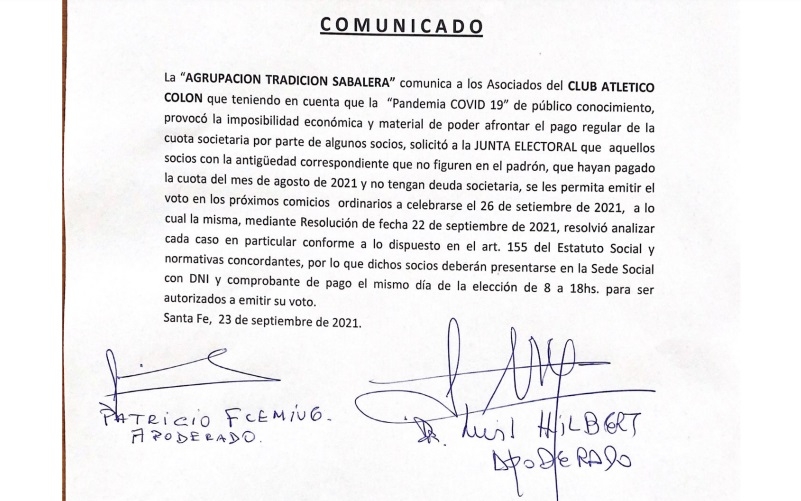 En este sentido, lo relevante está en que "se solicitó a la Junta Electoral que, aquello socios con la antigüedad correspondiente que no figuren en el padrón y que hayan pagado la cuota de agosto de 2021 y no tengan deudas, se les permitirá el voto en los próximos comicios ordinarios".