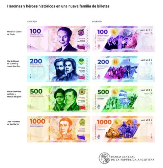 Eva Perón estará en el billete de $100, mientras que el General José de San Martín aparecerá en el de $1000. Otra particularidad de la nueva familia de billetes es que dos denominaciones incluyen la imagen de dos personas distintas: Juana Azurduy y Miguel de Güemes serán las caras del de $200 y Remedios del Valle con Manuel Belgrano del de $500.