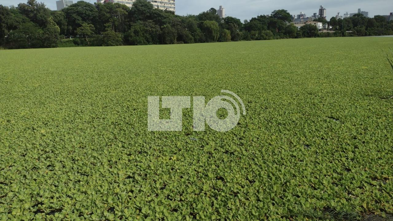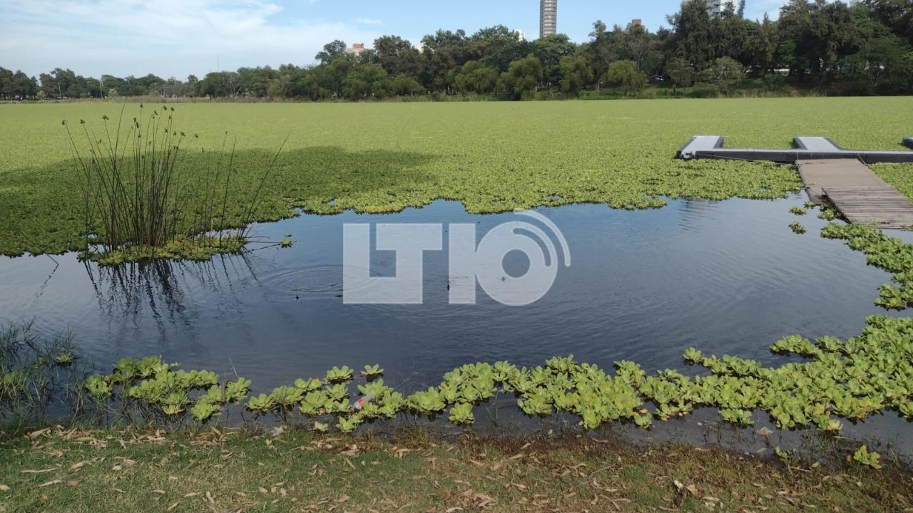 El lago del Parque Sur sigue siendo un terreno verde ganado por los repollitos de agua que no paran de reproducirse, pese al trabajo de empleados municipales que intentan sacarlos.