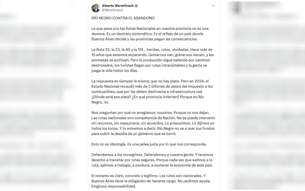 A través de sus redes sociales, Weretilneck aseguró que en 2024 el Estado nacional recaudó más de 2 billones de pesos por el impuesto a los combustibles, fondos que por ley deben destinarse a obras viales, y se preguntó “¿Dónde está esa plata? ¿En qué provincia invierten? Porque en Río Negro, no”.