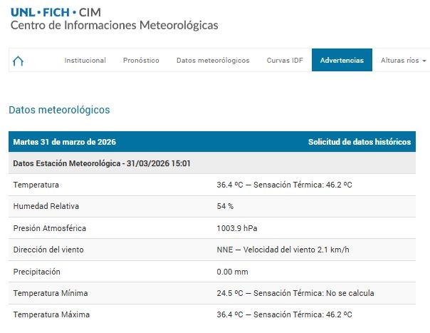 Ocurrió a las 15:01 de este martes, cuando la sensación térmica fue de 46,2°C, según consigna el Centro de Informaciones Meteorológicas de la FICH (UNL). A esa hora, la temperatura era de 36,4°C y la humedad, del 54%. La presión atmosférica estaba baja: 1003.9 hPa.