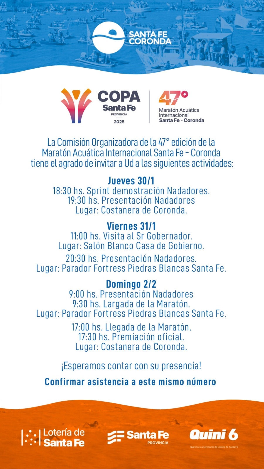 Para las 18.30 está previsto que se realice el Sprint demostración de los nadadores que intervendrán en la competencia del próximo domingo. Mientras que los actos protocolares, que ya son una tradición en la Santa Fe-Coronda, continuará luego con la presentación de los nadadores.