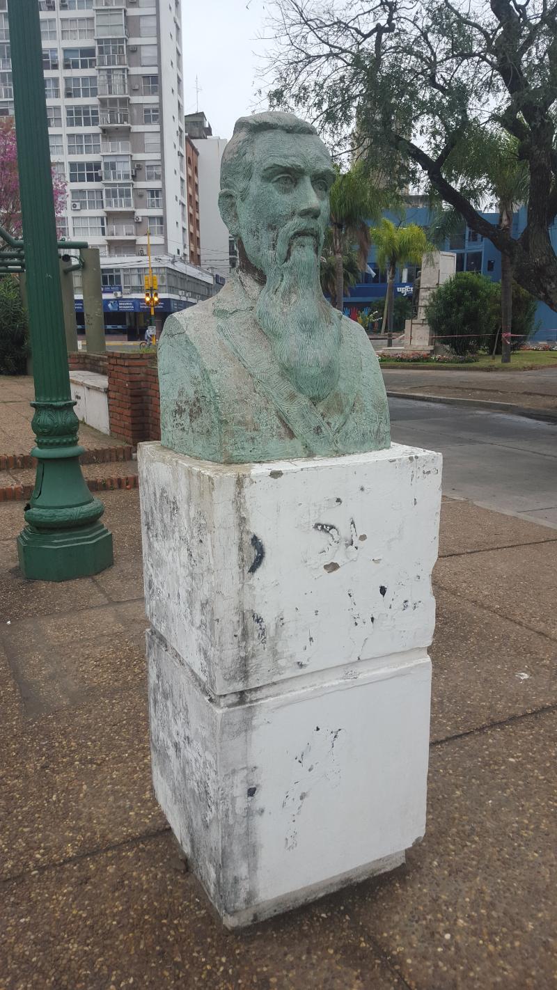 El busto que resalta la figura de Leandro N. Alem, ubicado en la plazoleta de calle Tucumán y Rivadavia, fue retirado este miércoles para su limpieza y restauración por parte de personal de la Secretaría de Cultura del Municipio.