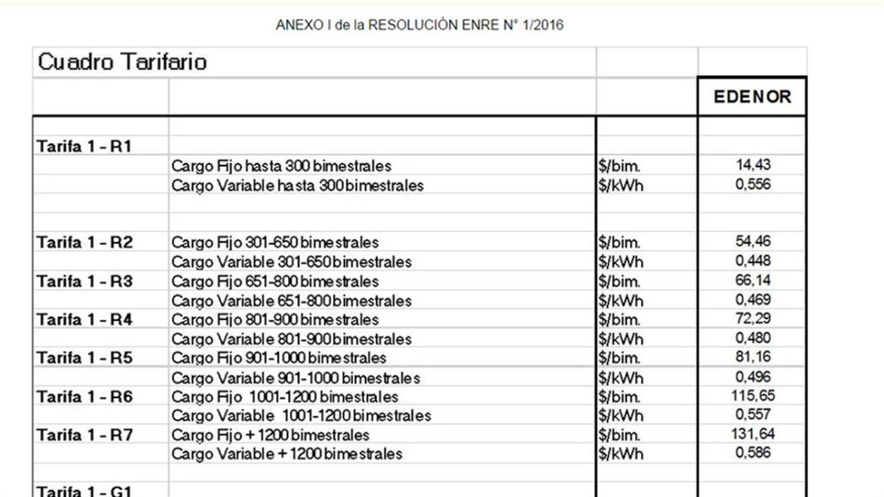 Los cuadros tarifarios, que son parte de la Resolución 1/2016 del ENRE, no hacen comparaciones con los valores anteriores, por lo que habrá que esperar el caso por caso para la evaluación final de los aumentos.