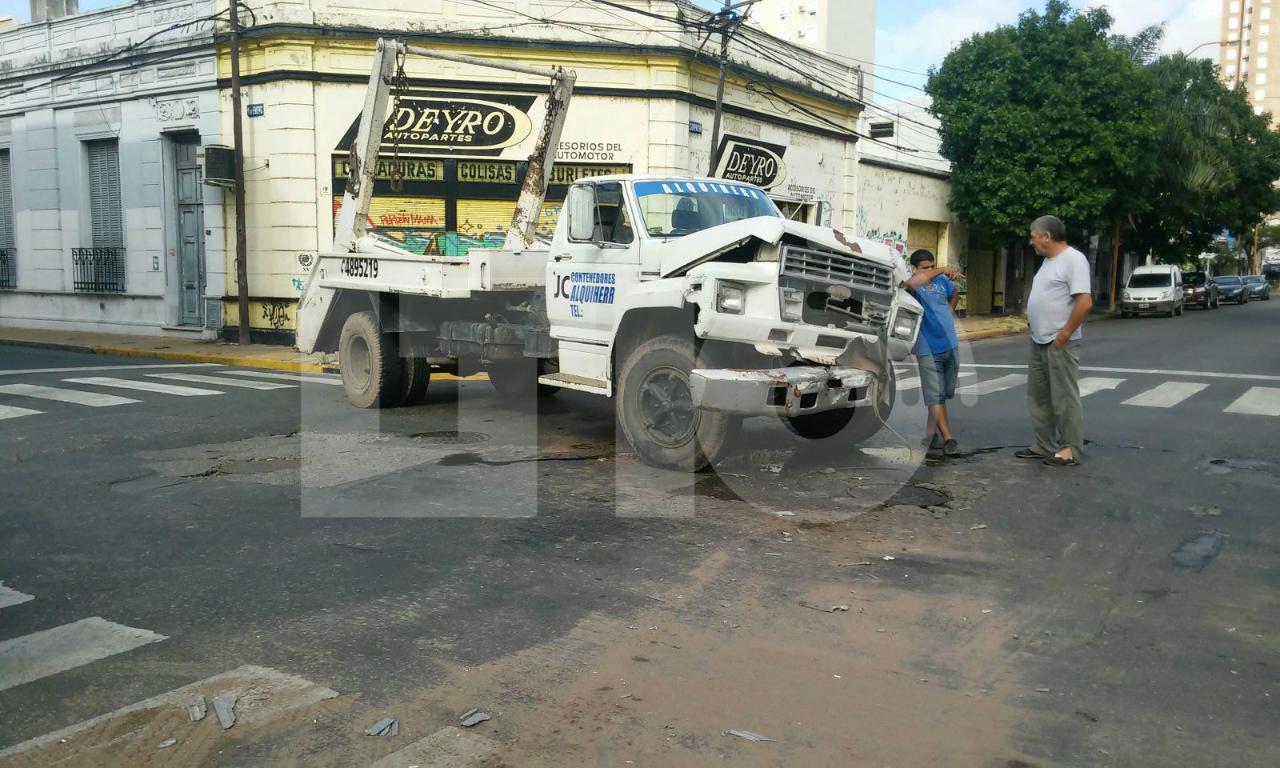 Un camión de contenedores y un colectivo de la línea tres chocaron en la esquina de 4 de Enero y Suipacha, a las 9 de la mañana aproximadamente.