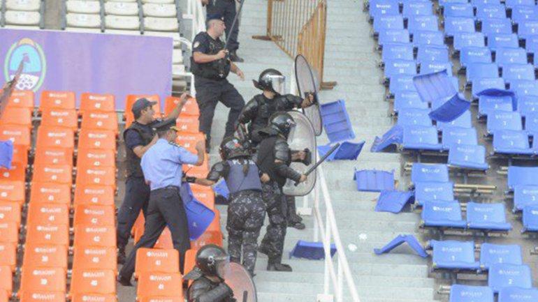 "Hay detenidos, pero no podemos confirmar el número de personas. Hay 32 policías lesionados,que recibieron golpes con elementos contundentes, como piedras o butacas. Gracias a Dios ninguno es de gravedad", explicó el jefe de la policía, Roberto Munives.
