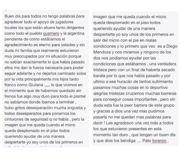 Algunos todavía no caen de haber estado al borde de la muerte. Fue una desgracia con suerte, como la llaman, porque las consecuencias pudieron haber sido mucho peores. Patricio Toranzoes el jugador que más tardará en recuperarse y mientras debaten si podrá volver a competir profesionalmente, él quiso agradecer al Pueblo Quemero y el mundo del fútbol en general por el apoyo recibido en estas horas difíciles.