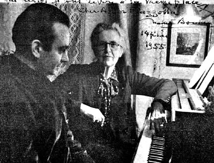 Astor Piazzolla frente al piano con la compositora francesa Nadia Boulanger, su maestra.