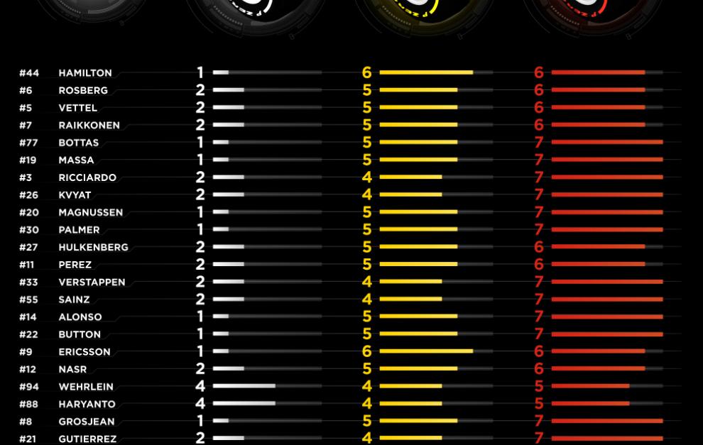 Así, el neumático superblando la sido la elección más elegida, el blando es la segunda opción más elegida con seis, cinco o cuatro juegos repartidos entre cada piloto; mientras que éstos han optado por uno o dos juegos de medios para todo el GP, exceptuando de nuevo a los dos Manor quienes llevarán cuatro cada uno.