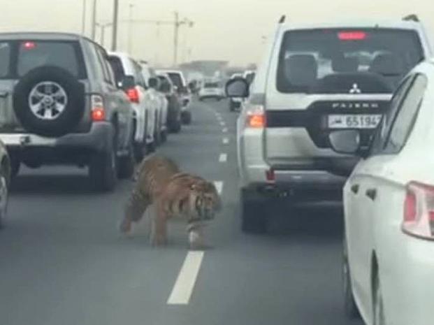 Se ha hecho viral un video en el que aparece un tigre caminando entre coches parados en un atasco en la ciudad de Doha, en Qatar. En la grabación se puede observar la repentina aparición del animal y acercamiento al coche del sorprendido autor del video.