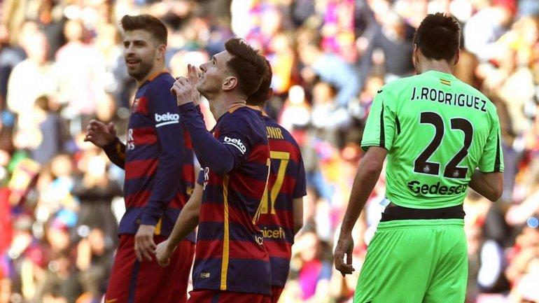 A los 7' Messi habilitó a Jordi Alba con un pase profundo hacia la izquierda del área. El lateral envío un centro bajo al área chica y la pelota se desvió en Juan Rodríguez, descolocando a Guaita. El balón entró pegado al segundo palo del arquero y fue el primero de los seis goles catalanes.