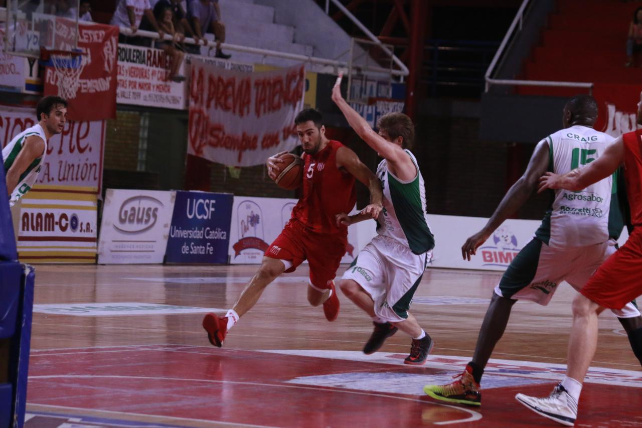 El partido arrancó a pedir de Unión. Un parcial de 7-0 aliviaba la ansiedad inicial. La defensa tatengue rozaba la perfección y el Tate manejaba el pleito al ritmo de Juan Kelly, de gran inicio. El primer cuarto fue de lo mejor de Unión en el torneo (tomando en cuenta la calidad del rival). En el inicio del segundo cuarto el Tate colocaba la máxima del pleito de diez (22-12). Allí Lotterio pidió tiempo muerto y su equipo cambió. No solo en el juego sino de protagonistas (29 de sus 39 tantos fueron provenientes de la banca). A la muy buena defensa interna tatengue, la visita logró romperla dándole la bola al poste a Lauría (quien convirtió 7 de 7 y 15 de sus 18 puntos de la primera mitad en el cuarto) y a Osella. Esto repercutió, naturalmente, en el otro aro, donde el equipo anfitrión se quedó sin opciones ofensivas certeras. Más puntos por individualismo que por conjunción de equipo hicieron que la primera mitad finalice 36-39.