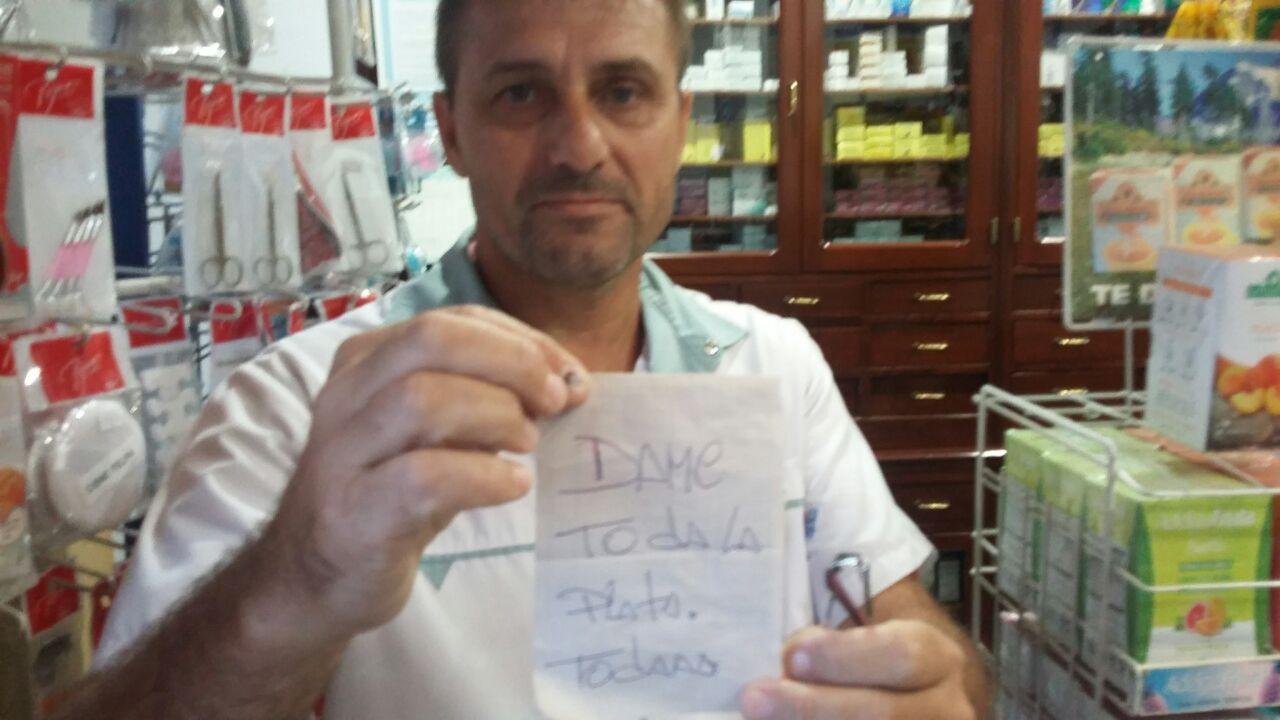 Una farmacia ubicada en Facundo Zuviría fue asaltada esta tarde, alrededor de las 18. Según relató su dueño, el delincuente ingresó hasta el mostrador donde dejó una nota que decía “Dame toda la plata, toda”, y exhibió un arma con la que amenazó al empleado.