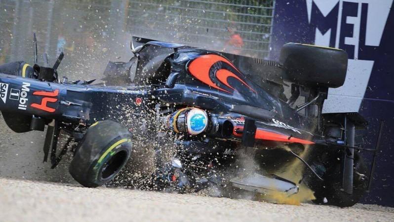 En el giro número 17, el español Alonso paralizó los corazones de todos los presentes cuando su automóvil salió despedido por el aire en la tercera curva de la pista y dio dos vueltas de campana, tras tocar con su rueda delantera derecha el neumático trasero izquierdo del mexicano Esteban Gutiérrez (Haas).