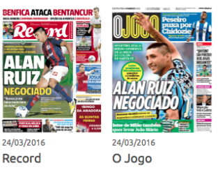 TRADUCCIÓN: El Sporting envió un emisario a la Argentina para contratar al centrocampista ofensivo Alan Ruiz, es el punto culminante de dos de los tres diarios deportivos portugueses. El jugador de 22 años de Colón de Santa Fe es el siguiente "objetivo" de los Leones.