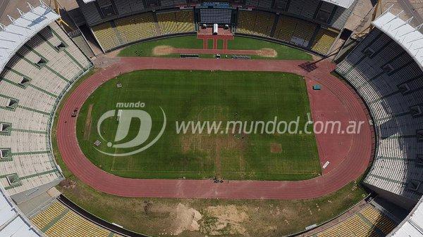La Agencia Córdoba Deportes prohibió en los últimos días el ingreso de cámaras al estadio y sólo difundió unas pocas imágenes tomadas al nivel del campo, por lo que no se podía observar el estado real del terreno de juego.