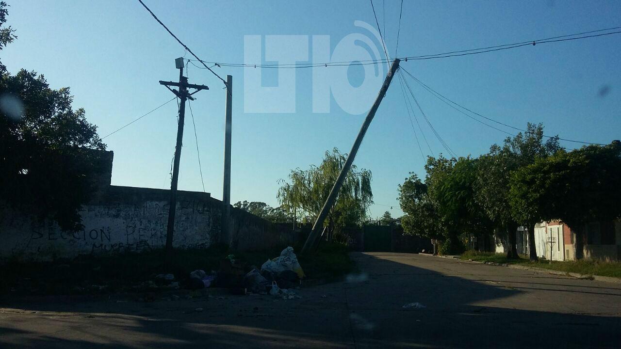 Desde el temporal que abatió la ciudad el pasado 19 de febrero, los postes de Telecom y alumbrado público que quedaron inclinados no fueron reparados en barrio Centenario.