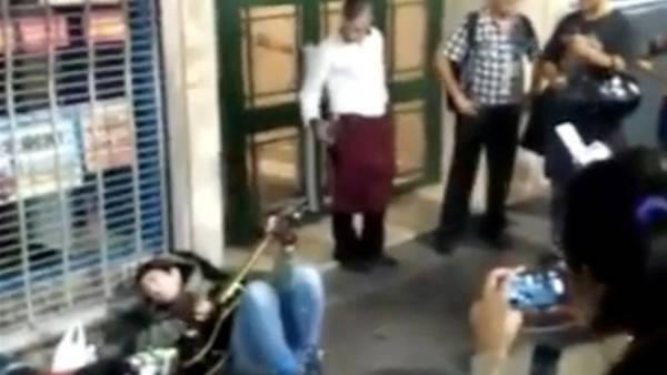 Recostado en el piso de la vereda, el cantante dio un mini show para las personas que transitaban