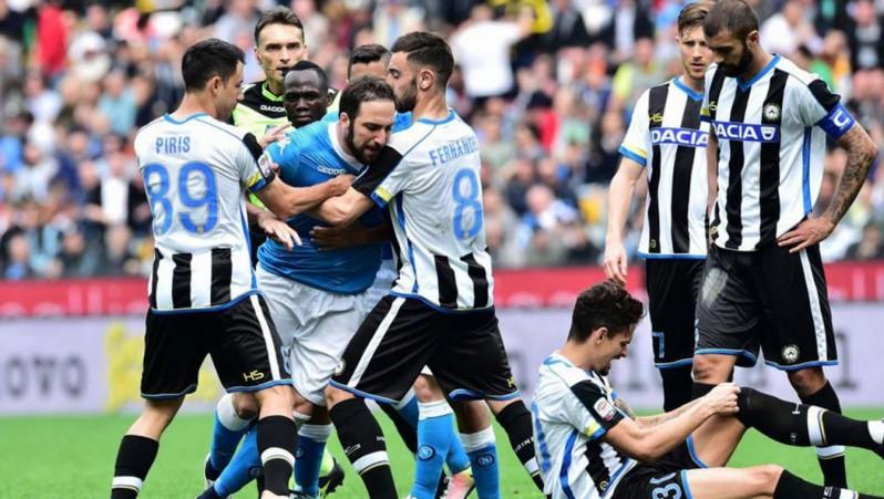 Higuaín fue expulsado a los 30 minutos del segundo tiempo tras una falta al brasileño Felipe, que le valió la segunda tarjeta amarilla, pero la sanción se agravó debido a que tras recibir la roja empujó al juez Massimiliano Irrati, encargado de controlar el encuentro que se llevó a cabo en el estadio Communale de Friuli, en Udine.