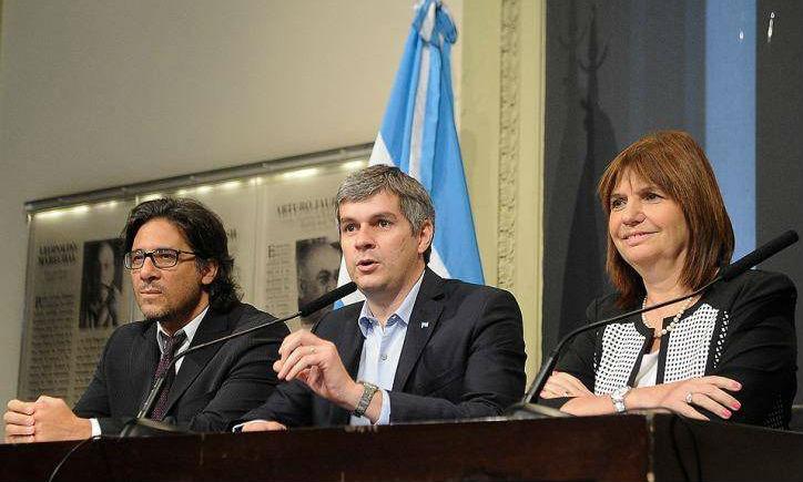 Marcos Peña en la conferencia de prensa junto a los ministros de Justicia Germán Garavano, y de Seguridad, Patricia Bullrich. Crédito: Victoria Egurza (Télam).