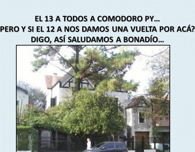 "Bonadío (sic) estás?", es el título del posteo publicado en el blog Memoria, Identidad y Resistencia. Allí, se incorporó una imagen de la casa del juez federal, con dirección, a la que convocan a un acto de repudio. "El 13 A todos a Comodoro Py... Pero si el 12 A nos damos una vuelta por acá? Digo, así saludamos a Bonadío (sic)...".