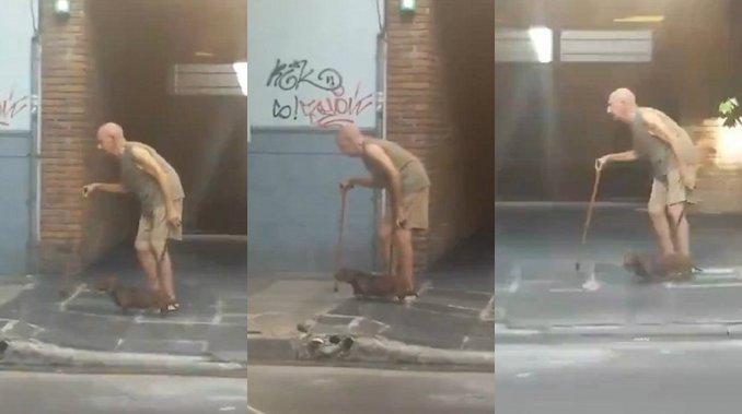 Un usuario compartió el video donde se puede ver cómo el hombre avanza con esfuerzo por la vereda mientras su fiel mascota lo acompaña a cada paso.
