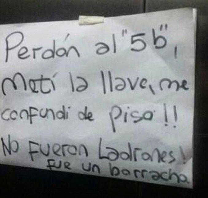 "Perdón al '5 b', metí la llave, me confundí de piso. No fueron ladrones. Fue un borracho", le escribió el hombre a su vecina, tras el error. La nota fue dada publicada en la cuenta de Facebook de "Vivir en Nueva Córdoba".