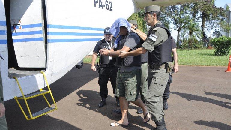 Esposado, con chaleco antibalas y custodiado por gran cantidad de efectivos de Gendarmería, Prefectura y la Policía Federal, Jorge Chueco llegó minutos después de las 14 al Aeroparque Metropolitano, procedente de Misiones, donde había pasado la noche tras ser detenido en Paraguay.