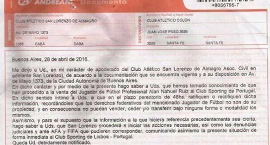 En las últimas horas se conoció la noticia sobre una carta documento de San Lorenzo al Colón mediante una carta documento. En la misma pregunta sobre la venta de Alan Ruiz a Sporting Lisboa y afirma poseer los derechos federativos del futbolista hasta tanto los Sabaleros no hagan uso de la opción.