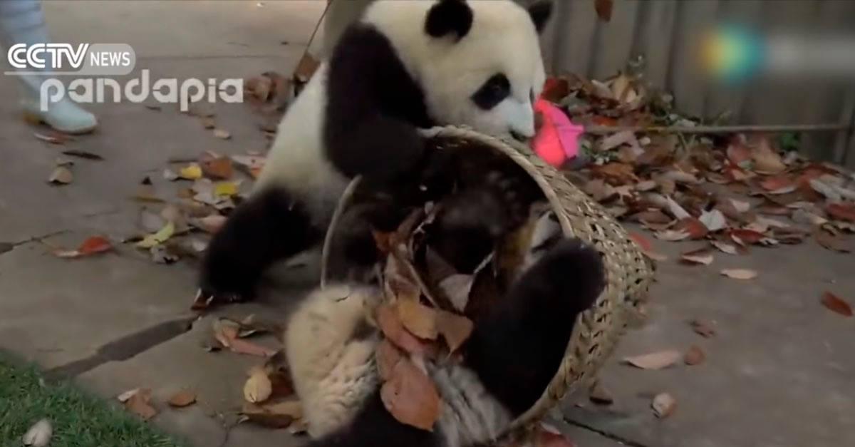 Dos osos pandas que viven en cautiverio en Sichuan, China, juegan con su canasta y no le permiten a la cuidadora limpiar su espacio.