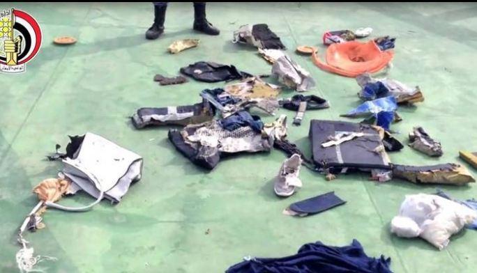 Las imágenes -una video de casi dos minutos de duración y cinco fotografías- permiten apreciar fragmentos del avión con logotipos de la compañía egipcia, partes de asientos y objetos personalesde los pasajeros.