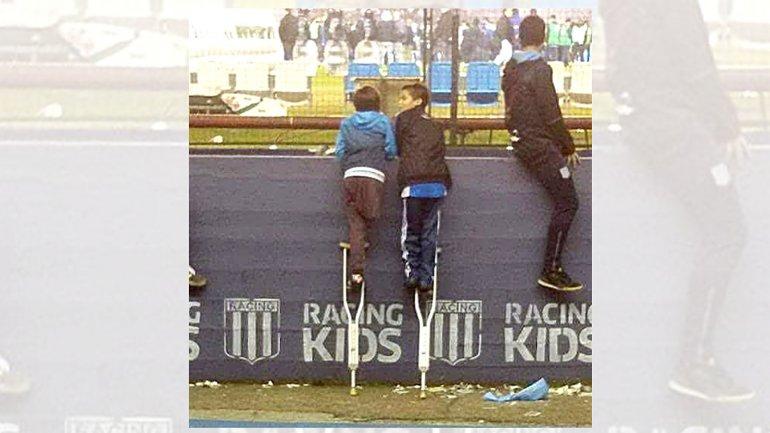 Dos niños, dos muletas y una imagen que emociona. El protagonista de la foto es Santiago Fretes, de 10 años, fanático de Racing. Nació con una malformación genética por la cual no pudo desarrollarse su pierna derecha pero que no le impidió, sin embargo, crecer en el sentido más valioso, el de la solidaridad.