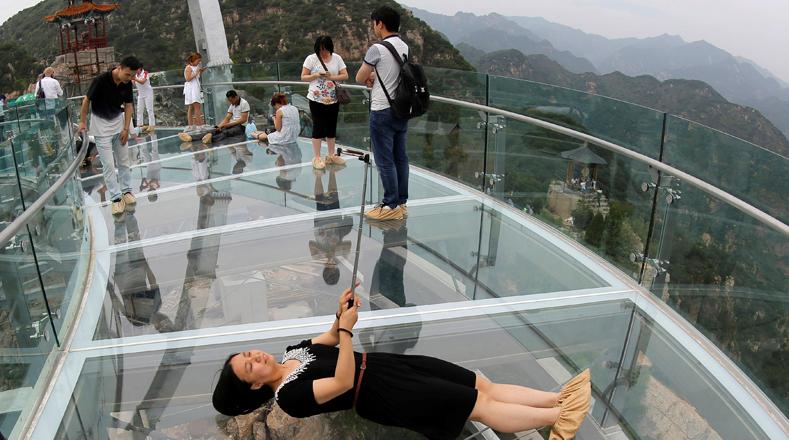 El piso de vidrio permite a los turistas tomarse fotos o selfies con el vacío bajo sus pies.Foto:Reuters