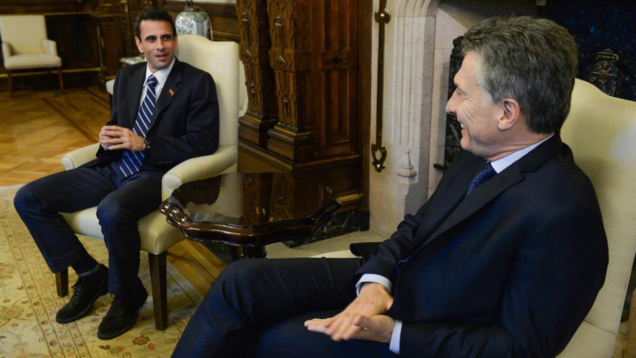 El presidente Mauricio Macri se reunió esta tarde en su despacho de la Casa de Gobierno con líder de la oposición venezolana y gobernador del estado de Miranda, Henrique Capriles , quien le solicitó respaldo para avanzar en un proceso "revocatorio" del actual mandato del presidenteNicolás Maduro , en el marco de "un proceso democrático".