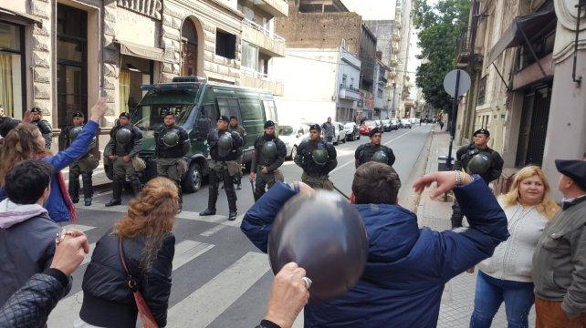 Los manifestantes concentraron en la Plaza Pringles y marcharon hasta el Monumento. Pero al llegar a La Rioja y Laprida se toparon con un vallado de Gendarmería, que cercaron la zona con camiones hidrantes.
