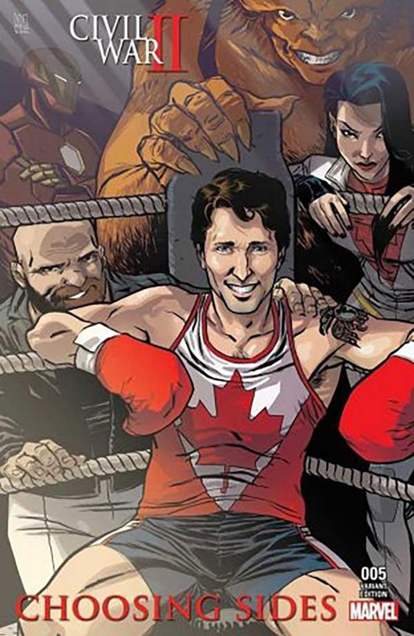 Justin Trudeau, primer ministro de Canadá, aparece en la esquina de un ring en la portada de la entrega número 5 de Civil War II: Choosing Sides de Marvel, donde se abordan conflictos éticos internos, al interior del mundo de los superhéroes.