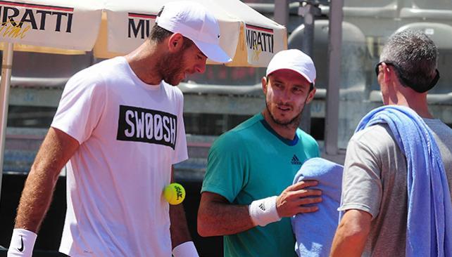 Del Potro y Mónaco pelotearon a ritmo intenso bajo un calor agobiante, con una temperatura de 33 grados, que obligó a los tenistas a refrescarse continuamente, con la atenta mirada de Orsanic y el subcapitán Mariano Hood y la curiosidad de los medios de prensa argentinos e italianos para ver en acción a los tenistas tandilenses.