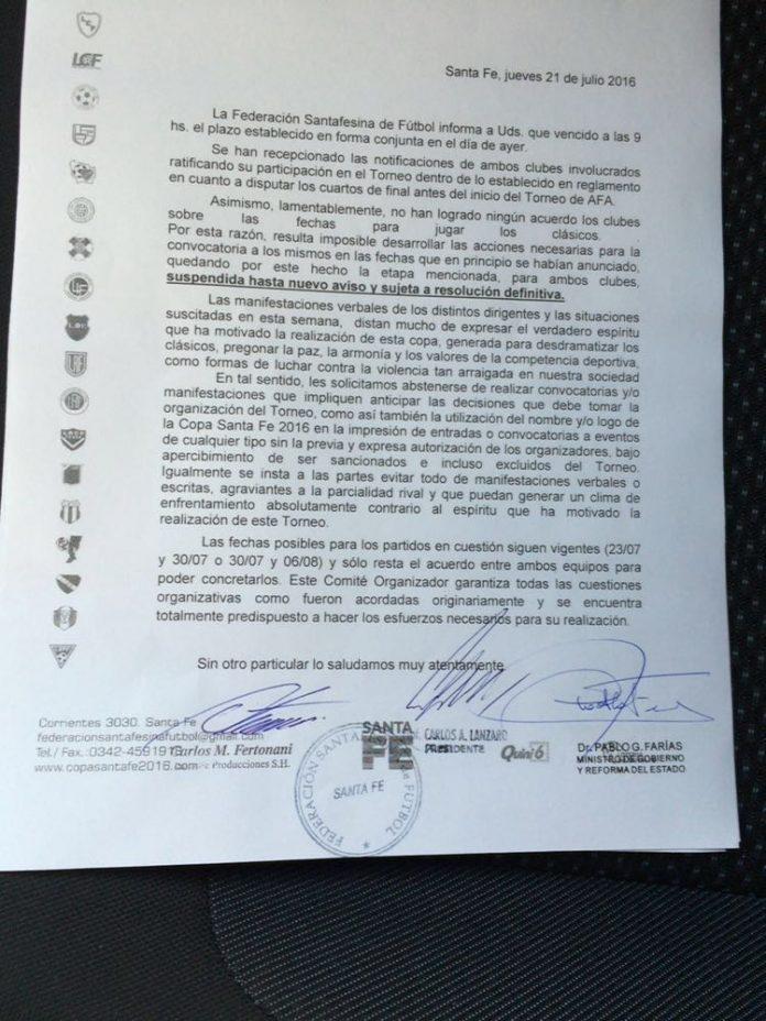 La Federación Santafesina de Fútbol informa que, habiendo vencido el plazo establecido en forma conjunta en el día de ayer, se han recepcionado las notificaciones de ambos clubes (Unión y Colón) involucrados en la disputa del clásico santafesino, ratificando su participación en el Torneo dentro de lo establecido en reglamento en cuanto a disputar los cuartos de final antes del inicio del Torneo de AFA.