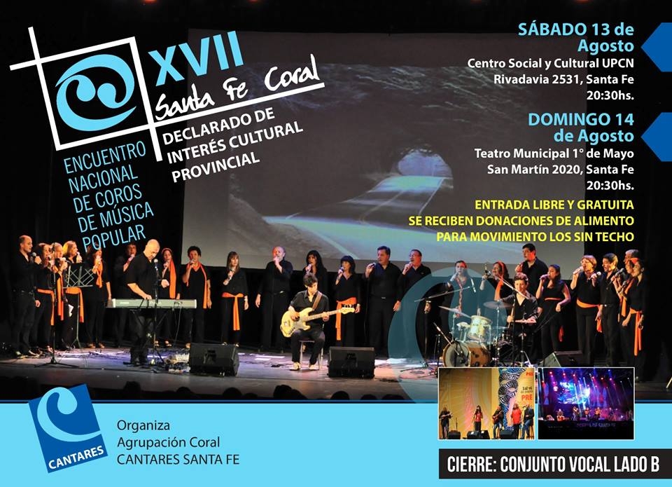 La XVII Santa Fe Coral que está organizada por la Agrupación Coral Cantares se realizará los días 13 y 14 de agosto a partir de las 20.30 en la sede del Centro Social y Cultural UPCN (Rivadavia 2531) y en el Teatro Municipal 1º de Mayo, respectivamente.