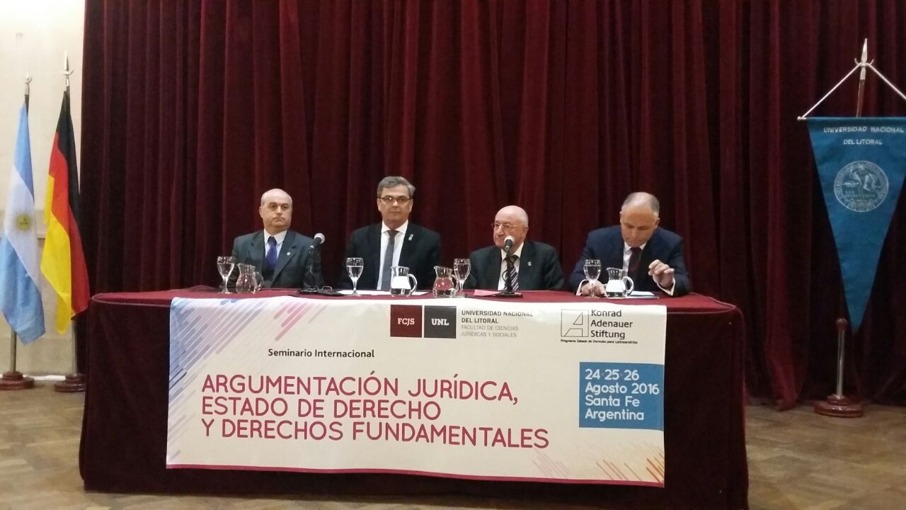 A continuación, y como primera conferencia del Seminario Internacional de Argumentación que tendrá lugar del 24 al 26 de agosto en la FCJS, Alexy disertó sobre su principal teoría en cuanto al Derecho y la Moral.