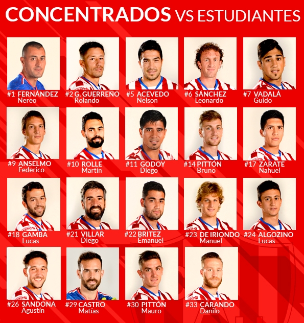 De esta manera, el equipo que enfrentaría al Pincha, con la recuperación de Nelson Acevedo (padecía un estado gripal) y de Diego Villar (molestia en los aductores) sería el siguiente: Nereo Fernández; Emanuel Britez, Rolando García Guerreño, Leonardo Sánchez y Nahuel Zárate; Diego Villar, Nelson Acevedo, Mauro Pittón y Lucas Gamba; Martín Rolle y Federico Anselmo. Sin embargo, como el entrenamiento fue a puertas cerradas, las ubicaciones en la mitad de la cancha y en la ofensiva todavía no están definidas, ya que podría jugar Rolle por derecha, Villar por izquierda y Gamba como delantero.
