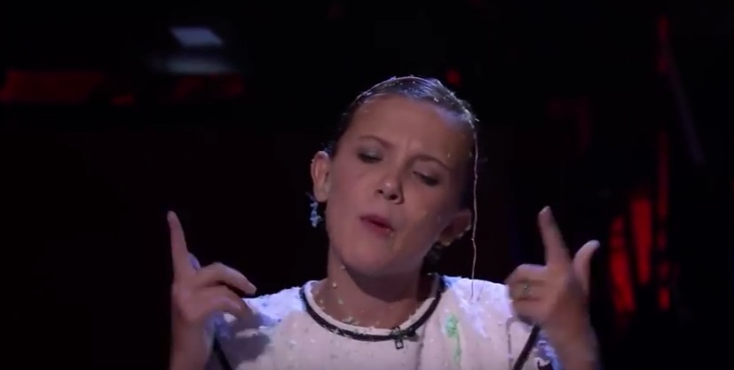 Al terminar su gran interpretación, la pequeña artista inglesa, de 12 años, compartió y se lanzó cotillón con el animador y sus compañeros en la producción de Netflix -Finn Wolfhard (Mike), Gaten Matarazzo (Dustin) y Caleb McLaughlin (Lucas)-, que va camino a su segunda temporada.